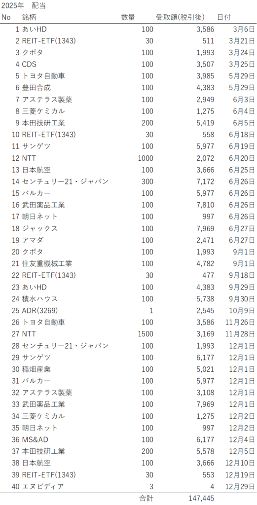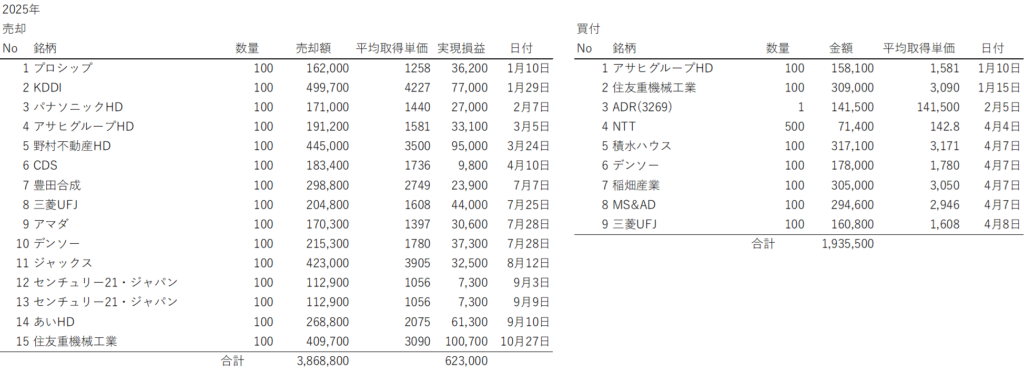 投資成績 売買、配当結果 2025年 goshobluem 2026年2月15日 2025年の売買結果は購入が194万円、売却が387万円で、利益は62.3万円(税別)でした。 また2025年の配当結果は14.7万円(税引後)でした。 2025年度は日経平均が年間通して上昇していく相場であまり売買せずに高値になったら売るスタイルとなり、売買の額は小さくなりました。 三菱UFJは売るのがさすがに早すぎて反省です。 コメントを残す コメントをキャンセルメールアドレスが公開されることはありません。 ※ が付いている欄は必須項目ですコメント ※ 名前 ※ メール ※ サイト 次回のコメントで使用するためブラウザーに自分の名前、メールアドレス、サイトを保存する。 上に表示された文字を入力してください。 Δ 投資、株、資産運用 CTAサンプル これはCTAサンプルです。 内容を編集するか削除してください。