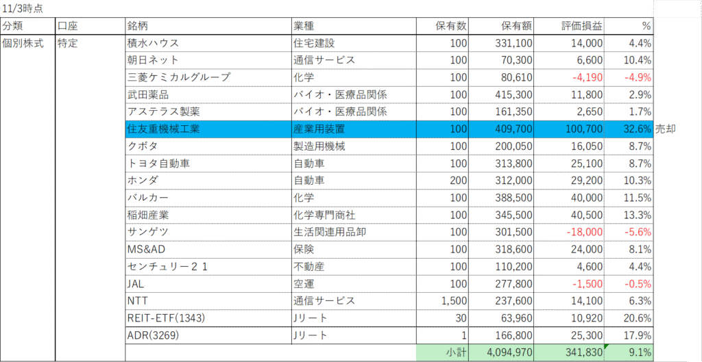 急騰した住友重機械工業を利確しました。造船のクレーン事業やっており造船関連銘柄として急騰したようですが、事業のメインのイメージがなかったため利確しました。