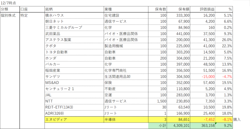 11月の結果は+363,158円、+9.2%でした。
