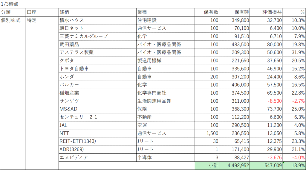 今年の実現損益は上記の含み益を除いて先月と変わらずの+623,000円です。