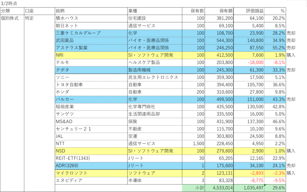 実際の売買については多数売って利確しました。米国のSaaS関連株がAIに代替されていく論で暴落し、日本のSaaS関連株もその煽りを受けて暴落していたのでNRIとNSDを拾いました。